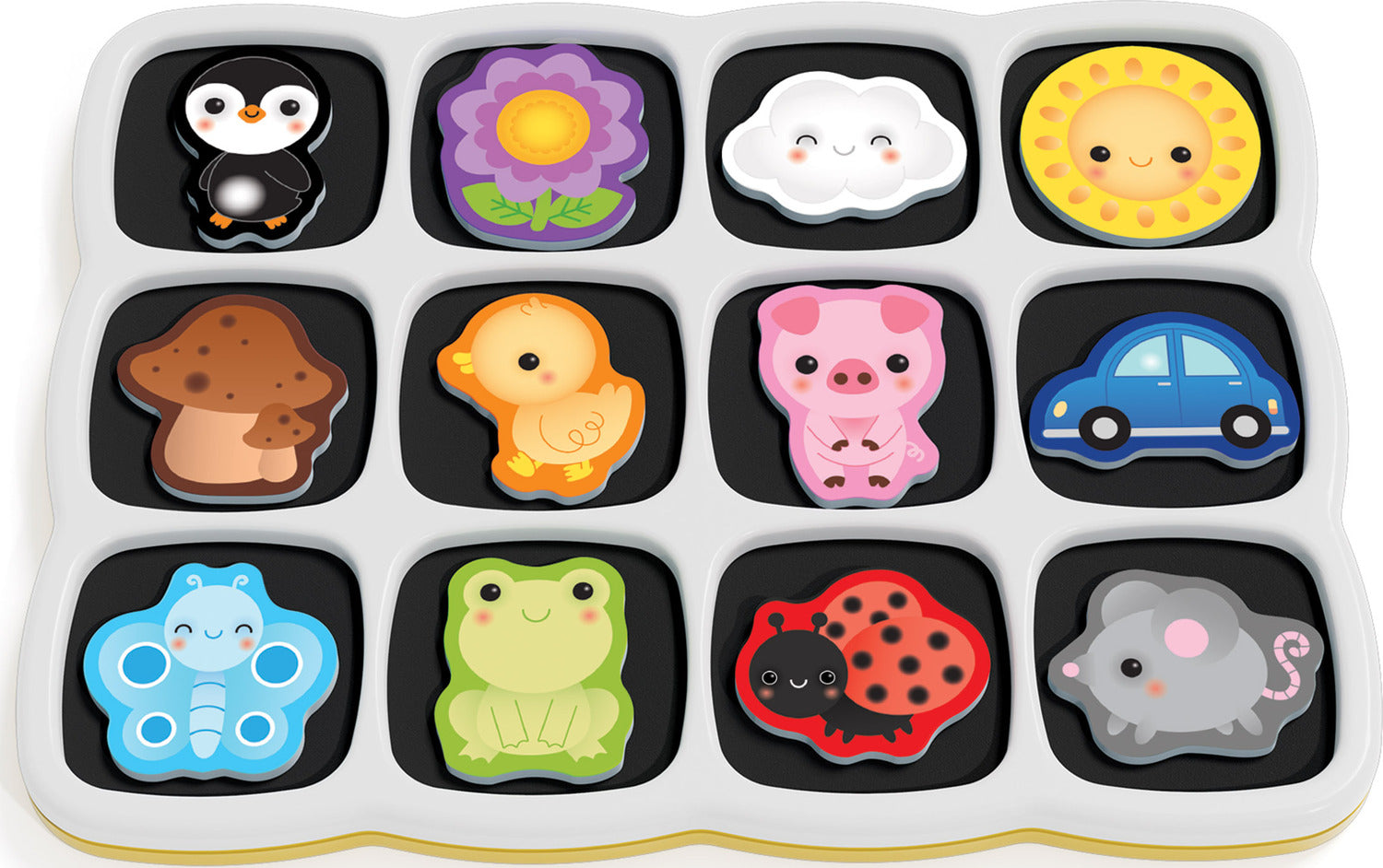 A perfect first puzzle for kids ages 1 and up! We love the extended play value of this double-sided magnetic puzzle. One side features 12 cute pieces for kids to recognize and place in the correct color-coded spaces. The other side is a magnetic board with a colorful pond scene so the puzzle piece characters can go on storytelling adventures!