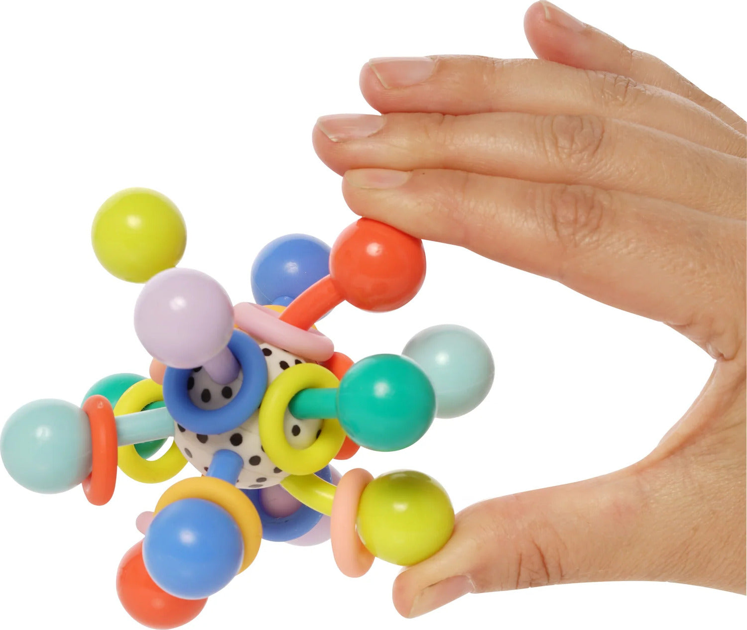 A refreshed version of our award-winning Atom rattling teether toy! Twelve colorful bendy arms with textured ends stem from the round center of this easy-to grasp teether toy. Plastic clacking rings on each arm rattle with every shake. Encourage motor development, cause-and-effect learning and color exploration with this diaper-bag friendly rattling teether toy.