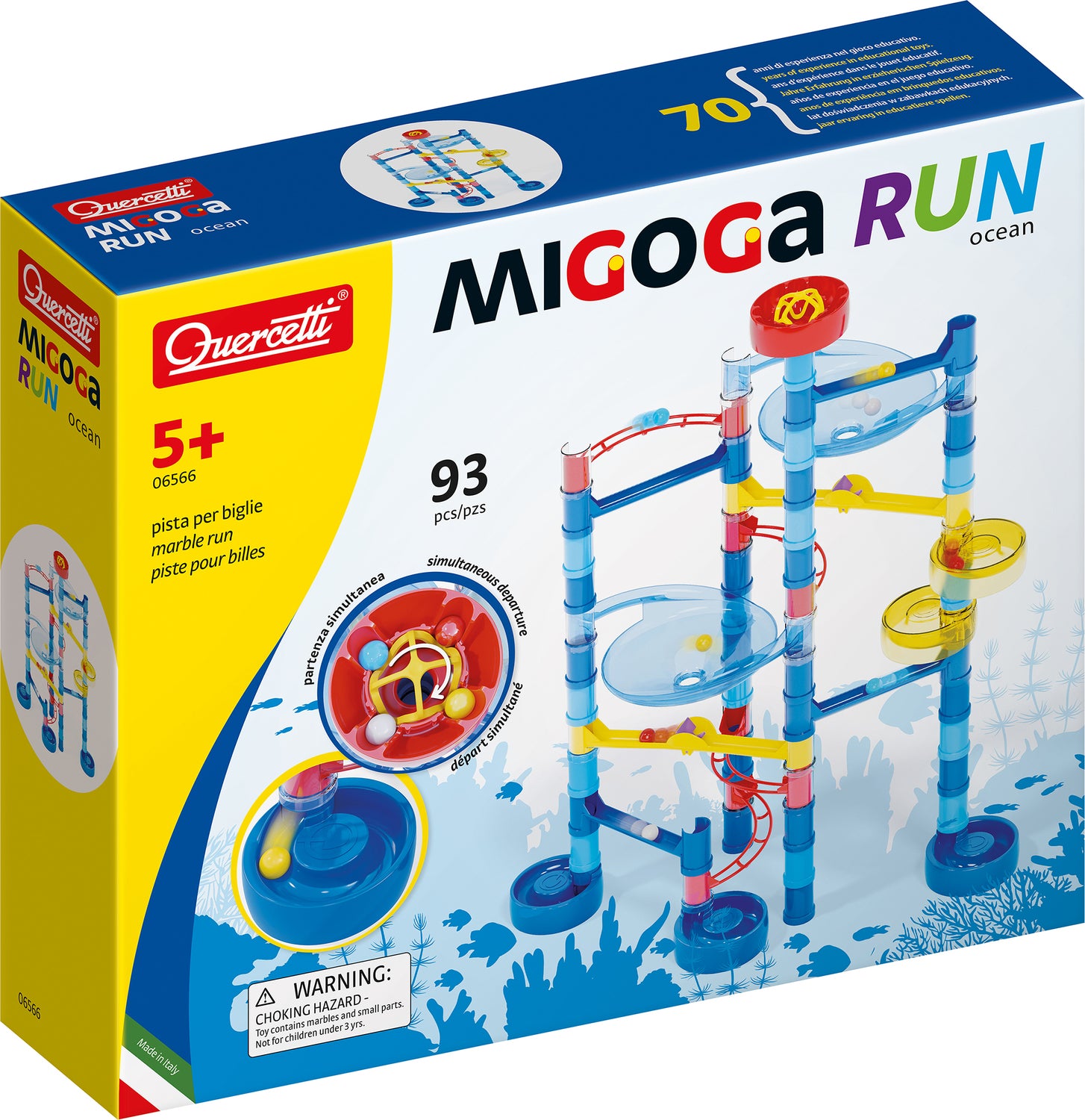 Colorful balls that take off at the same time but follow different paths, through ocean currents, deep waters, tropical islands and underwater worlds, navigating vortices, straight lines and curves, on this marble track that features the shapes and colors of the ocean. There are plenty of pieces to build tracks like the ones in the illustrations, or to create completely new and original ones. Slides, bridges, columns and spirals can be easily fitted together in infinite combinations for endless fun playtime.